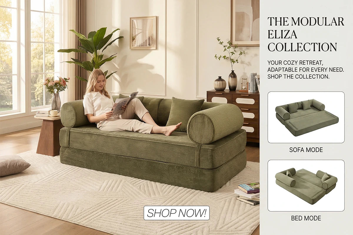 Sectional Couch Ottoman, Corduroy Futon Sofa, Boneless Couches for Living Room and Bedroom, No Assembly Required