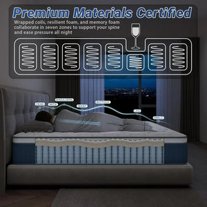 • CUSTOMIZED COMFORT FOR SLEEPERS - queen mattress blends contouring hybrid memory foam with a 7-zone box spring system to deliver balanced support for your back, hips, and shoulders. No matter your sleep position, the mattress relieves pressure points and helps keep your spine naturally aligned