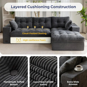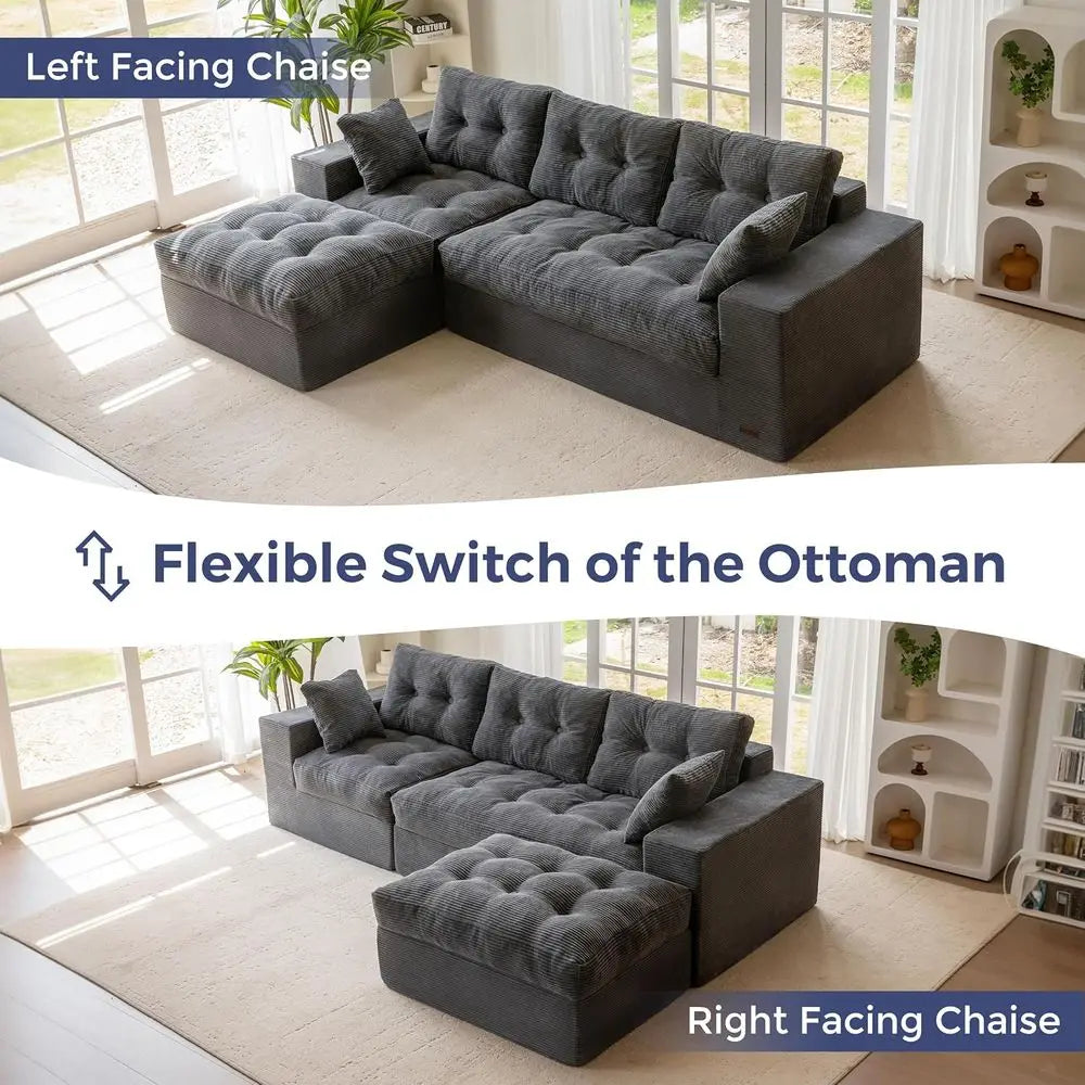 Two-Layer Cushion Comfort: Built for both structure and softness, this sectional sofa features a dual-cushion design. The base is made of dense foam for strong, stable support, while the upper layer is filled with plush shredded foam that molds to your body—delivering a cozy, cloud-like lounging experience you’ll love sinking into